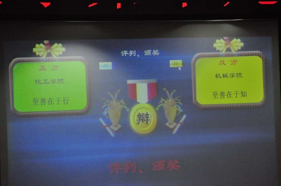 决赛中,辩论主题为“至善在于行还是知”,分为各方观点陈述、相互提问和自由辩论三个环节。担任正方的是化工学院代表队,担任反方的是我院代表队,所持观点为“至善在于知”。我院由2015级井天智、李阳、王师煜、邢迎光、李腾腾同学组成代表队在比赛中引经据典、旁征博引,经过激烈的辩论最终获得第一名。