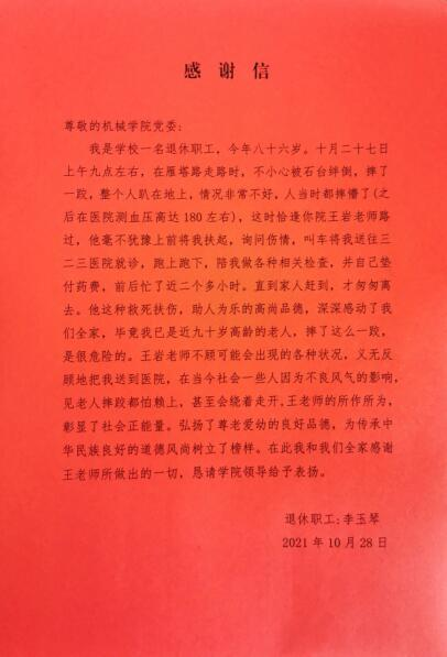 11月3日,米兰milan党委收到一封来自退休职工的感谢信。八十六岁高龄的李奶奶在信中讲述了我院机械电子系青年教师王岩偶遇她不慎摔跤时给予无私帮助的前后经过。