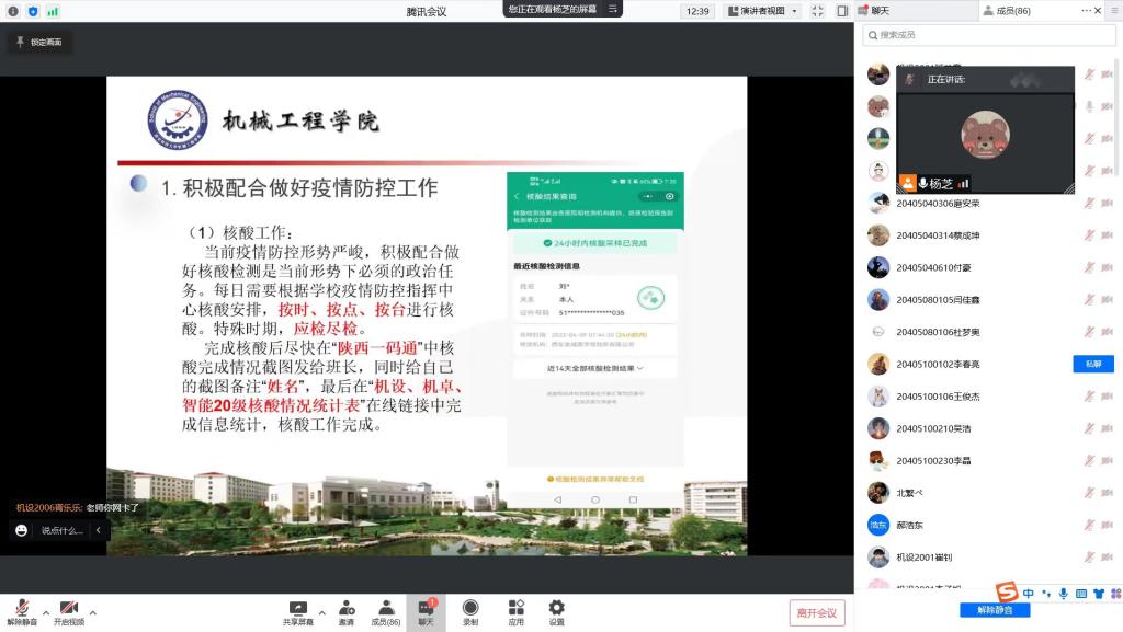为进一步做好校园新冠肺炎疫情防控,增强学院两校区学生疫情防控的思想认识和行动自觉,4月10日晚上,机械学院组织全体在校研究生和本科生召开线上疫情防控年级会。