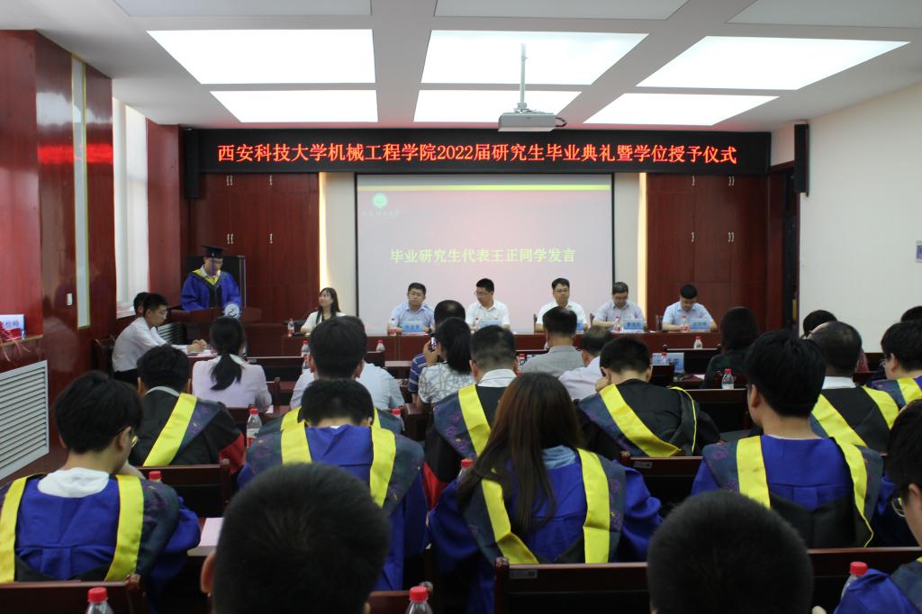 毕业典礼在雄壮的国歌声中拉开帷幕。仪式上,副院长赵栓峰教授介绍了学院2022届研究生基本情况;教务处处长、学院学位评定分委员会主席张旭辉宣读了2022届研究生毕业及学位论文授予决定;学院党委书记张金来老师宣读了优秀毕业生和优秀学位论文获得者表彰决定。研究生王正代表学院全体毕业生发言,饱含真情的分享了自己的求学感悟与体会并向学校学院的教育培养表达诚挚的感谢。在校研究生代表刘永为学长们送上美好的祝福,表示将以学长们为榜样,不断在科研领域开阔更加辽阔的疆域。高扬副教授作为研究生导师代表深情寄语毕业生,期望同学们不忘初心,继续奋斗,发扬优良传统,锤炼品格,提升能力和本领,服务人民,报效祖国。院长曹现刚教授代表学院向即将毕业的2022届全体毕业生圆满完成学业表达了热烈祝贺和殷切期望,希望同学们志存高远,牢记“祖国利益高于一切”的校训,踏实肯干、勇于挑战、积极进取,久久为功,身体力行弘扬西科胡杨精神,为中华民族伟大复兴的中国梦做出应有的贡献。张传伟教授在致辞中勉励全体毕业生要学习老一代机械人“做人、做事、做学问”高尚品格和优良传统;坚定理想信念,不断增强做中国人的志气、骨气和底气;无论在何地从事何种工作,都要保持钢铁般的意志和必胜的信心,以实现民族复兴为己任,勇担行业“卡脖子”技术,攻坚克难,把个人成长成才与国家建设发展相结合,同频共振、同向同行,情系母校,共创美好未来。