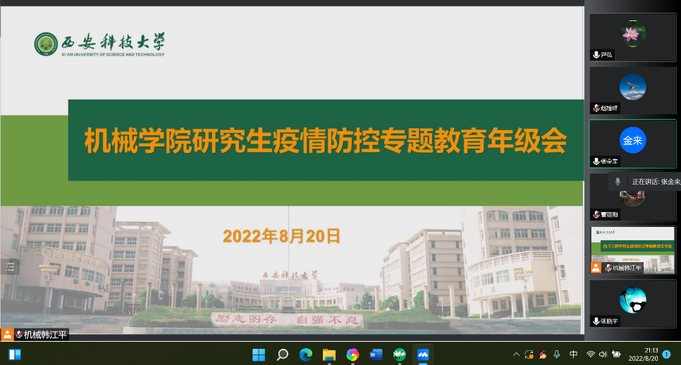 8月20日晚,机械学院召开线上研究生疫情防控专题会。学院党委书记张金来、院长曹现刚,副院长赵栓峰以及研究生培养办公室相关人员,全体在校研究生参会。会议由学院党委副书记尹弘主持。