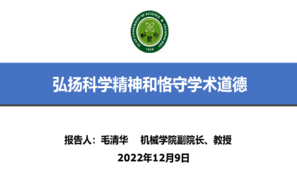 毛清华教授结合科学精神的内涵、自身成长经历和多年来对学术科研工作的体会与感悟,并围绕“批判和怀疑精神”“创造和探索精神”“实践和探索精神”“平权和团队精神”以及“奉献和人文精神”进行阐述;并对“学术道德与学术规范”基本准则做了解读,剖析了学术不端行为相关的案例,并要求同学们应当恪守学术道德,遵纪守法,弘扬科学精神,实事求是,正确对待科研活动中存在的直接、间接或潜在的利益关系,真正做到“三个统一”,即学问和学位的统一,为人和为学的统一,科学精神与人文精神的统一,做一名优秀的科技工作者。