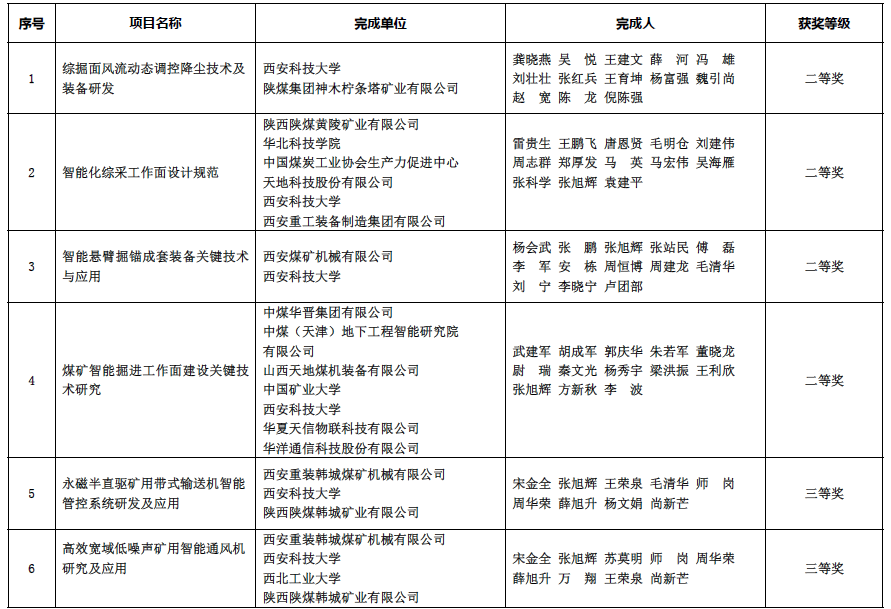 机械学院龚晓燕教授牵头,吴悦副教授、薛河教授、张红兵副教授、赵宽博士、倪陈强博士参与完成的“综掘面风流动态调控降尘技术及装备研发”,马宏伟教授、张旭辉教授参与完成的“智能化综采工作面设计规范”,张旭辉教授、毛清华教授参与的“智能悬臂掘锚成套装备关键技术与应用”和张旭辉教授参与完成的“煤矿智能掘进工作面建设关键技术研究”荣获二等奖。张旭辉教授、毛清华教授、薛旭升副教授、杨文娟副教授参与完成的“永磁半直驱矿用带式输送机智能管控系统研发及应用”和张旭辉教授、薛旭升副教授、万翔博士参与完成的“高效宽域低噪声矿用智能通风机研究及应用”荣获三等奖。近年来,机械学院坚持把发展科技第一生产力、培养人才第一资源、增强创新第一动力有机结合,坚持问题导向,聚焦行业发展需求,充分发挥团队优势,积极开展有组织的科研和推进学院高质量发展,科技成果转化及服务社会能力显著增强,有效提升了机械学科影响力。