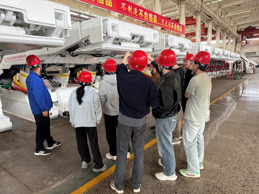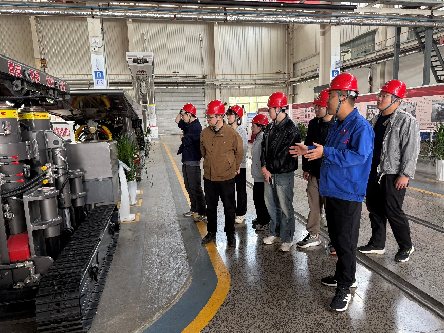 会后,在公司工程师的陪同讲解下,师生一行深入生产一线,先后参观了结构件分公司、机加工分公司和总装分公司,近距离了解煤矿液压支架产品从下料、焊接、机加到总装的全流程生产过程。在现代化的焊接生产车间,先进的高效激光切割机、焊接机器人等智能装备正在有序运行,企业工程师详细介绍了公司引入的窄间隙焊接技术及标准化在线管控体系,展示了传统煤机生产向数字化、智能化转型升级的成果。在总装车间,一台台即将出厂的液压支架产品整齐排列,企业导师结合产品实物,向同学们讲解介绍了超大采高智能化掩护式支架等核心产品的结构设计原理和技术特点。