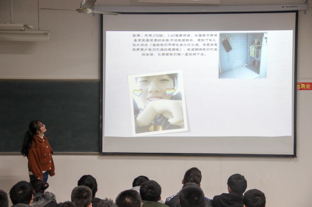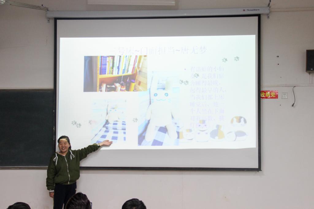 评选过程中,进入决赛的十个宿舍的代表一一上台,将自己的宿舍以ppt的形式展现给评委们。他们宿舍的主题也让人耳目一新,如:常青藤、扬帆远航、咖啡小屋等。各式各样的装饰风格让在座的同学眼前一亮,用掌声来赞美寝室的魅力。而每支队伍的成员也在介绍中陈述着自己对寝室装扮的理解,他们指出寝室是自己相处四年的家,而这个家就需要每一个人都用心去维护,需要每个人去装扮,也只有每个人用心对待,这个“家”才会越来越美丽。在评选中,评委们秉承公平负责的态度,认真聆听他们的演讲,仔细观看他们的PPT,打出最后的分数,并为获奖宿舍颁奖。