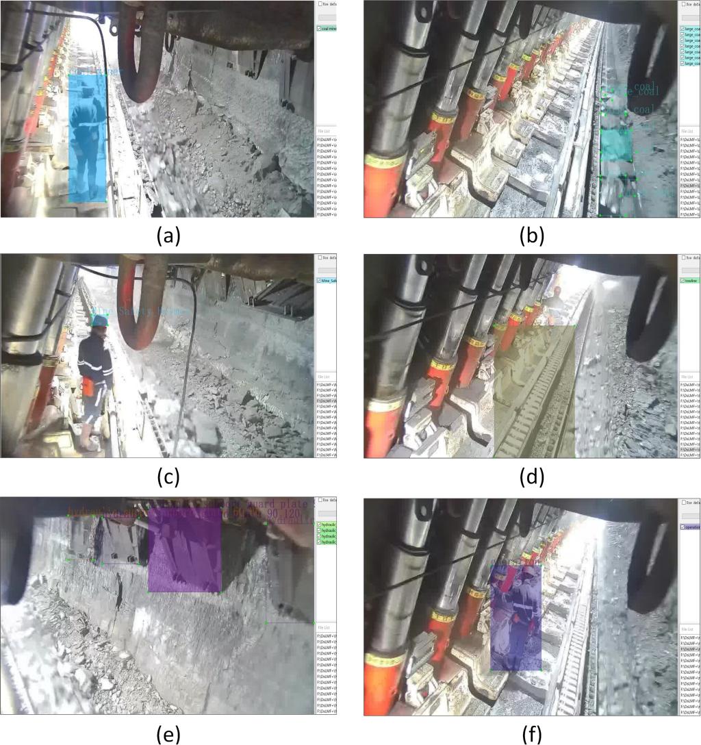 (d)拖缆 (e)液压支架护帮板 (f)矿工行为