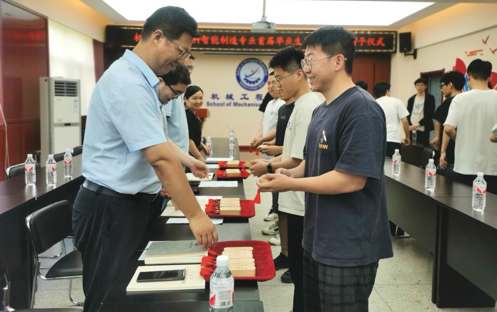 院长曹现刚在仪式上做总结讲话,结合学院人才培养方案与大家共同回顾了智能制造新工科专业设立的背景以及建设情况,充分肯定了同学们四年来在专业素质能力培养方面取得的成就。并结合学院十四五规划目标,阐释了中国制造2025大背景下进一步完善智能制造新工科专业课程体系建设、知识传授、技能训练、品格塑造等方面的人才培养的重大现实意义。“未来可期、不负韶华”专属毕业纪念品寓意深刻,他勉励同学们要始终坚定理想信念和成才自信,作为新工科智能制造专业首届毕业生,要身体力行传承“祖国利益高于一切的校训”,争做懂工艺流程、数据分析、人工智能等融合机械工程、计算机科学与技术、控制工程等多学科专业、勇于创新实践的复合型人才,为中华民族伟大复兴、为中国式现代化强国建设贡献自己力量。