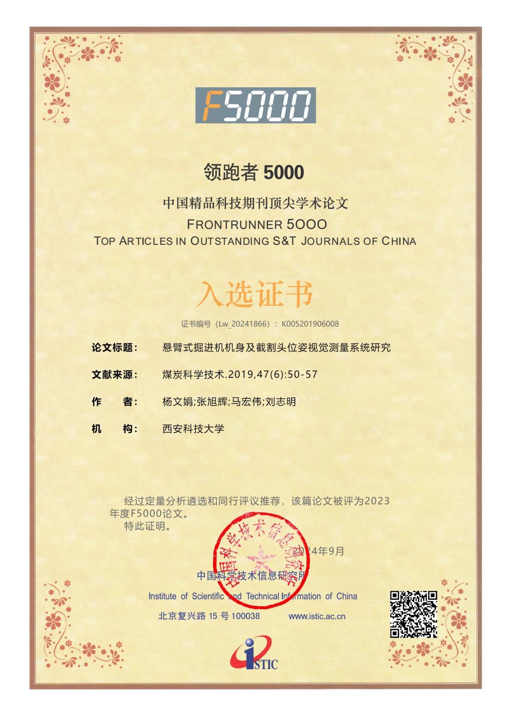 近日,科技部中国科学技术信息研究所(中信所)发布了2023年度“领跑者5000-中国精品科技期刊顶尖学术论文(F5000)”的入选论文名单。机械学院曹现刚教授团队发表在《煤炭科学技术》上的论文“面向煤矸分拣机器人的煤矸识别定位系统研究”和张旭辉教授团队发表在《煤炭科学技术》上的论文“悬臂式掘进机机身及截割头位姿视觉测量系统研究”入选2023年度F5000。