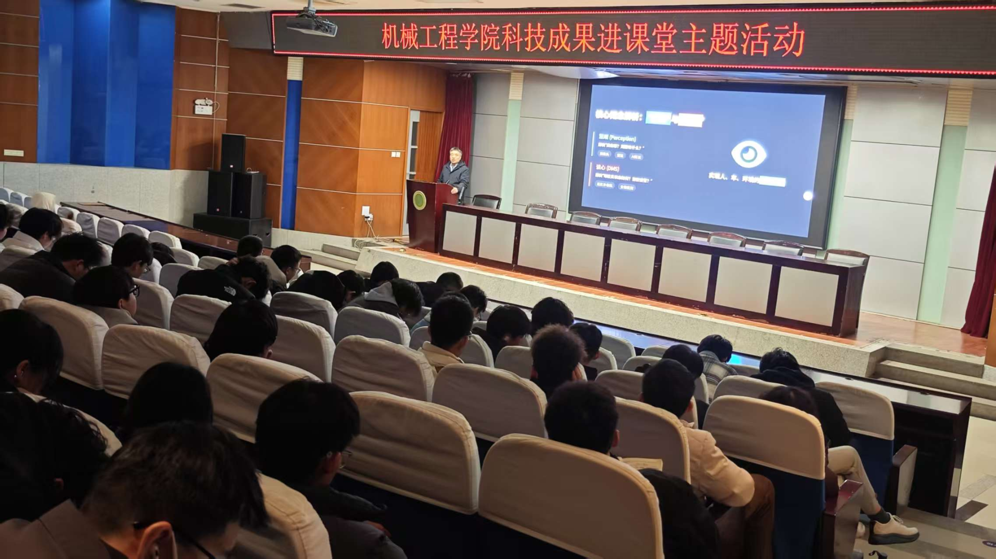 报告第二阶段,赵栓峰教授以《新能源车辆的 “慧眼” 与 “读心术”— 无人驾驶环境感知与驾驶人状态监测技术》为题做报告。他围绕车辆工程 “电动化、智能化” 变革核心,从多源传感器的物理机理与数据特性切入,对比分析了视觉主导、多模态融合等主流技术路线的性能边界。通过 BEVFormer、Occupancy Network 等深度学习模型应用案例,深入解析了高精度目标检测与语义分割等前沿算法如何实现感知精度与实时性的平衡,并延伸介绍了驾驶人行为识别、疲劳监测、人机共驾决策等关键工程环节,前瞻性探讨了大模型知识驱动、舱驾一体中央计算架构等下一代技术发展趋势,凸显了环境感知与状态监测系统在无人驾驶领域的 “慧眼” 与 “读心” 核心价值。本次报告会主题突出、信息饱满且案例鲜活,兼具理论深度与实践指导性强,助力学生开阔视野,增强对行业前沿的认识和了解,进一步坚定学科自信和成才自信。