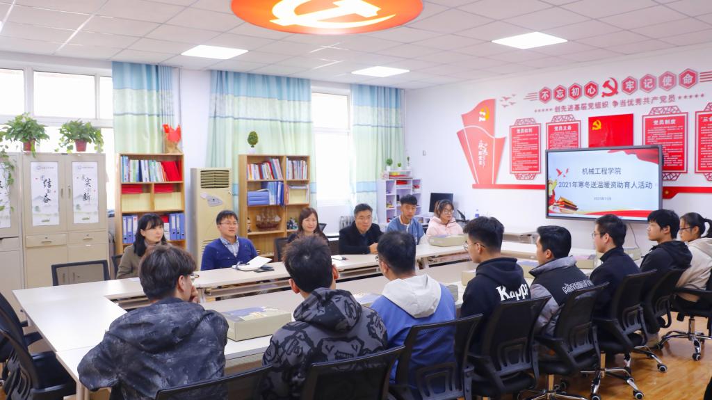 机械学院于1122日“小雪”节气当日下午在骊山校园学院党员活动室举办“寒冬送温暖”资助育人座谈会。学院党委副书记尹弘、副院长赵栓峰、团委书记周学刚和资助专项负责辅导员郭静以及家庭经济困难学生代表参加本次活动。