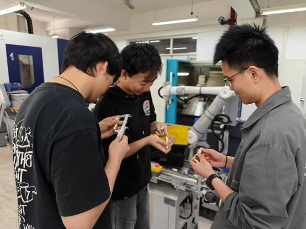 “用数控机床加工黄铜印章,就像给传统工艺装上了‘智能大脑’。”智能制造专业学生小石展示作品时感慨,“通过数字化设计,我们能轻松实现手工难以完成的复杂造型。”;“与手工篆刻不同,数控加工需要将艺术创意转化为精确的数字指令,每一个参数的调整都会影响最终效果。”机设专业的学生小李介绍道;“我们尝试将院徽也刻在竹节印章上,通过数控加工的浮雕工艺,让文字既有立体感又不失篆刻韵味。”机设专业的学生小杨展示作品时说道;“黄铜质地较硬,切削过程中容易产生碎屑和热变形,我们通过调整冷却液流量和主轴转速,才保证了竹节纹理的细腻度。”机卓专业学生小王介绍。