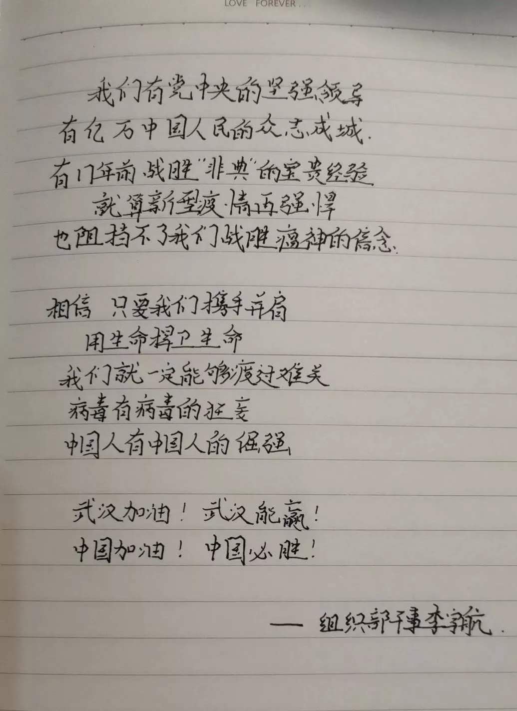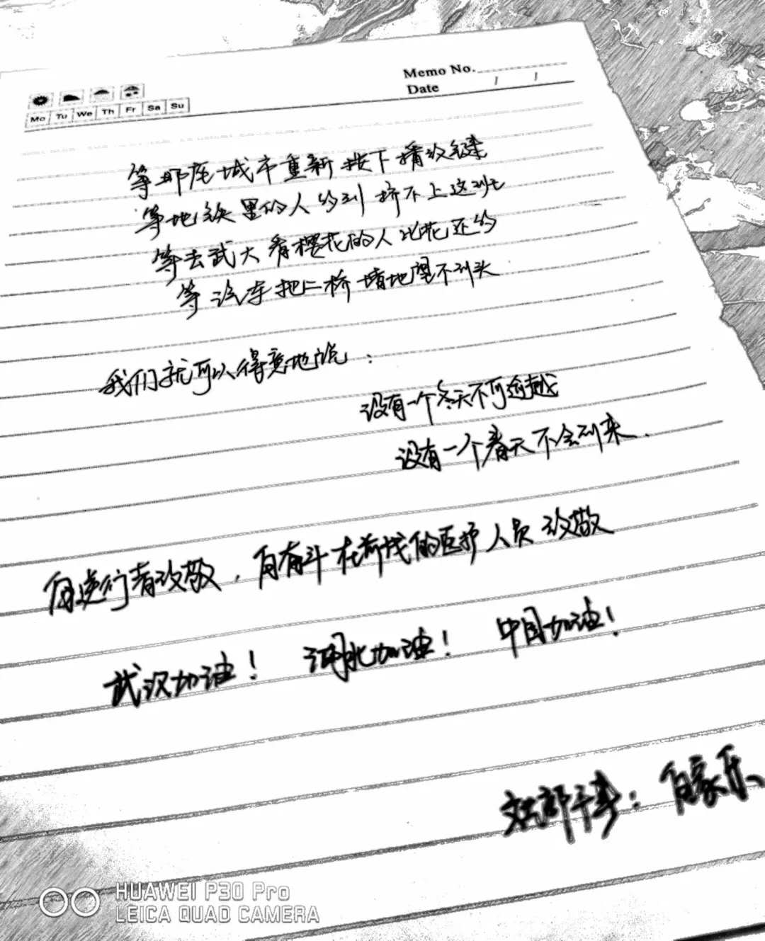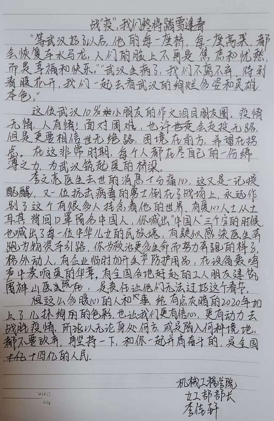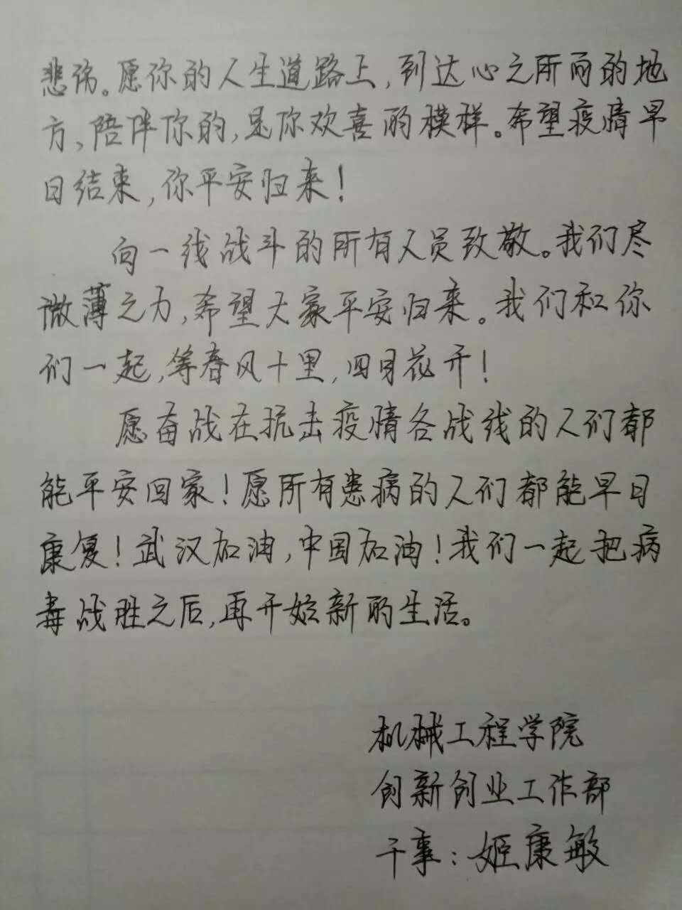 提到武汉,你想起的是“黄鹤一去不复返”的黄鹤楼,还是三四月间武大烂漫的樱花,亦或是热气腾腾唇齿留香的热干面? 然而,这个春节我们说起武汉,更多的是谈论一串串冰冷的数字,一场来势汹汹的肺炎疫情。 一方有难,八方支援。在此危难之际,我校机械学子也与祖国同呼吸,以赤忱之心,为武汉献上最诚挚的祝福。 在这场战“疫”中,我们每个人都是战士。我们或许无法成为奋战在一线的白衣天使,但是我们也可以用自己的方式为他们加油,为武汉加油。