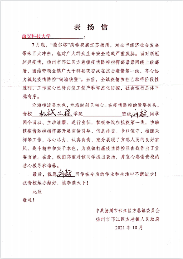 2021月7月底,“德尔塔”病毒突袭江苏扬州,对广大群众生命安全造成严重威胁。米兰milan中国机械学院机械电子工程2021级学生刘超不畏艰险,勇于担当,在经过疫苗注射和核酸检测后加入了首批抗疫志愿者队伍,并担任组长,积极奋战在抗疫第一线,协助医疗人员进行全市核酸检测工作,与交警维持卡口交通管制等,与其他志愿者齐心协力共同筑起疫情防控“铜墙铁壁”,为当地疫情防控做出贡献,受到中共扬州邗江区方巷镇委员会的高度评价与肯定。