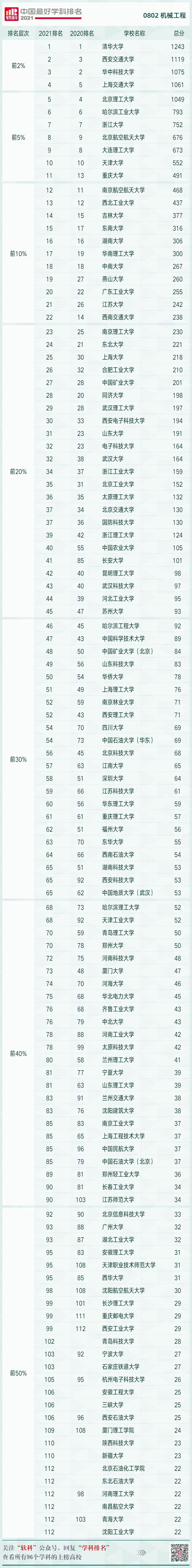 2021年10月25日,高等教育评价专业机构软科正式发布“2021软科中国最好学科排名”。机械工程学科排名共有117所大学上榜,米兰milan中国机械工程学科排名第65位,进入软科排名前30%,相比2020年上升27位(2020年软科排名第92位)。完整排名名单如下: